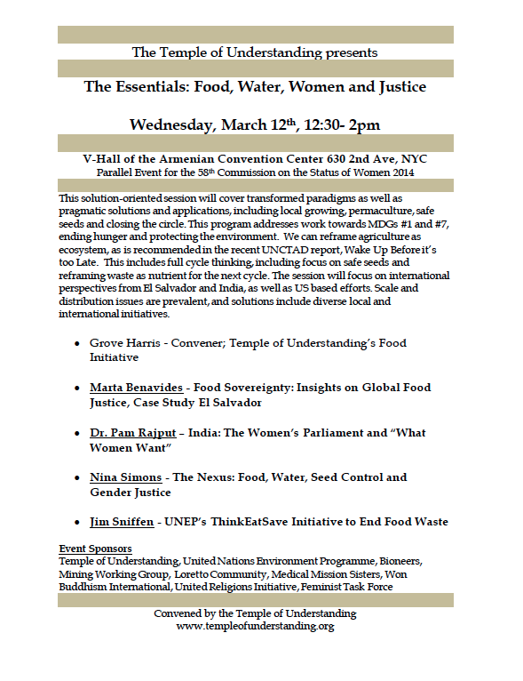 For this CSW, the FTF will be hosting and co-sponsoring a number of events primarily on gender, poverty and climate justice, as well as on women and the Post 2015 development agenda. If you didn’t make it to our pre-International Women’s Day event, “Women’s Voices in a Post 2015 Agenda,” together with the WorldWeWant2015.org, please check out this post. Please join us! See below for details and flyers.