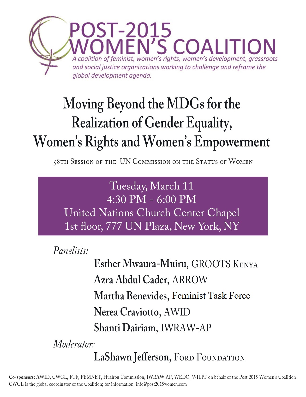 Moving Beyond the MDGs for the Realization of Women’s Rights & Gender Equality – together with Post 2015 Women’s Coalition (including Center for Women’s Global Leadership, Huairou Commission and other partners). FTF’s Marta Benavides will be a presenter at this event.