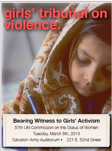 - Tribunals as megaphones. The First Girls’ Tribunal: The Feminist Task Force in collaboration with the Working Group on Girls held The Girls’Tribunal on Violence, the first Tribunal to feature only the voices of girls. Women’s Tribunals have taken place all across the world with over 20 organized by FTF in Asia, Africa and Latin America. For the CSW 57 the Girls’ Tribunal on Violence featured a group of courageous girls who testified to the impact that violence has had on their lives and the creative means they have taken to stand against it. A distinguished panel of jurists responded to the testimony and provided recommendations to the girls and policymakers on how to address violence against girls.