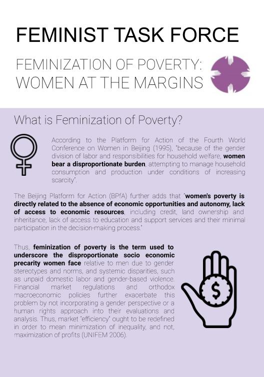 The Feminization of Poverty: Women at the Margins primer explores how multi-dimensional poverty and its contributing factors, such as the lack of health services, lack of education, inadequate living standards, poor quality of work, gender-based violence, and living in areas that are environmentally hazardous, among others, contribute to the feminization of poverty.